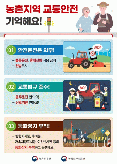 농기계 사고는 농기계 사용이 집중되는 4~6월과 9~11월에 많이 발생하고 있으며, 농촌의 좁은 농로와 경사진 비탈길, 어두운 도로에서는 사소한 부주의에도 큰 사고로 이어질 수 있어 각별한 주의가 필요하다. 또한 농기계 작업 전 사전점검 미실시, 무리한 기계 조작, 반복작업에 따른 안전 수칙 소홀 등이 주요 원인으로 꼽힌다.