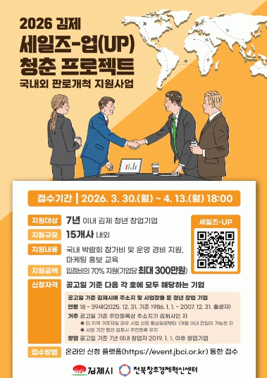 정성주 김제시장은 “청년 창업기업이 지역을 넘어 국내외 시장으로 진출할 수 있도록 판로개척 지원을 강화하겠다”며 “우리 청년들의 꿈을 끝까지 뒷받침하는 든든한 환경을 만들겠다 ”고 말했다.