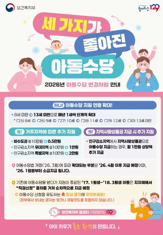 보건복지부의 아동수당법 (법률 제21489호, 2026.3.20.) 개정에 따라, 남원시는 기존 만 8세 미만이던 아동수당 지급 나이를 만 9세 미만까지로 상향 조정하고, 2026년부터 매년 1세씩 연장하여 2030년에는 13세 미만 아동까지 지원 대상을 확대한다.
