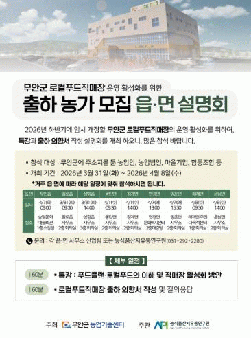 이번 설명회는 기존 참여농가와 신규 참여를 희망하는 농업인을 대상으로 진행되며 ▲맛뜰무안 먹거리 통합플랫폼 구축사업 설명 ▲로컬푸드 직매장 운영 절차 안내 ▲출하 의향 조사 및 현장 상담 등으로 구성된다.