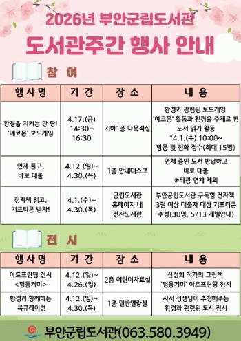행사 참여 신청은 오는 4월 1일부터 도서관 방문 또는 전화로 가능하며 행사에 관한 자세한 사항은 도서관 누리집(홈페이지)을 참고하거나 도서관으로 문의하면 안내받을 수 있다.