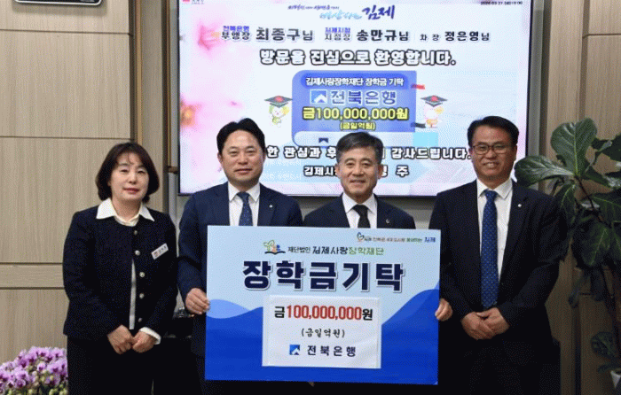 이날 기탁식에는 김제사랑장학재단 정성주 이사장을 비롯해 전북은행 최종구 부행장, 송만규 김제지점장, 정은영 차장 등이 참석해 지역 인재들을 위한 희망의 메시지와 함께 장학금을 전달했다.