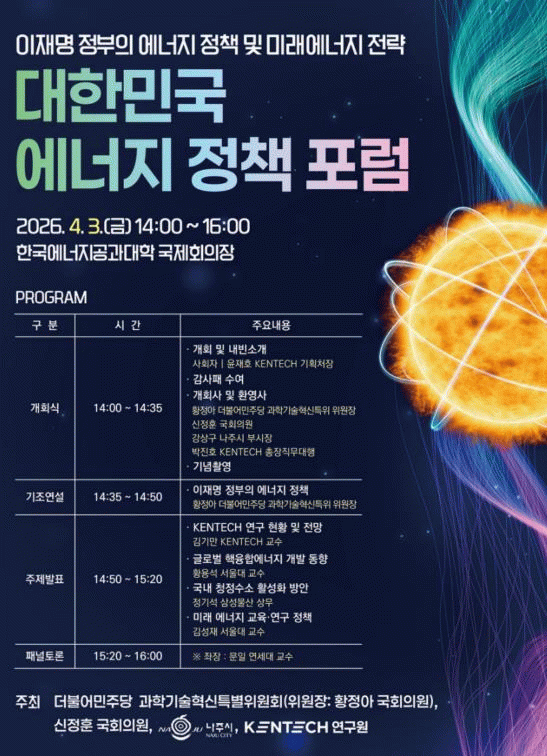 나주시는 더불어민주당 과학기술혁신특별위원회, 신정훈 국회의원, KENTECH 연구원과 함께 오는 4월 3일 오후 2시 한국에너지공과대학교 국제회의장에서 ‘대한민국 에너지 정책포럼’을 공동 개최한다고 27일 밝혔다.