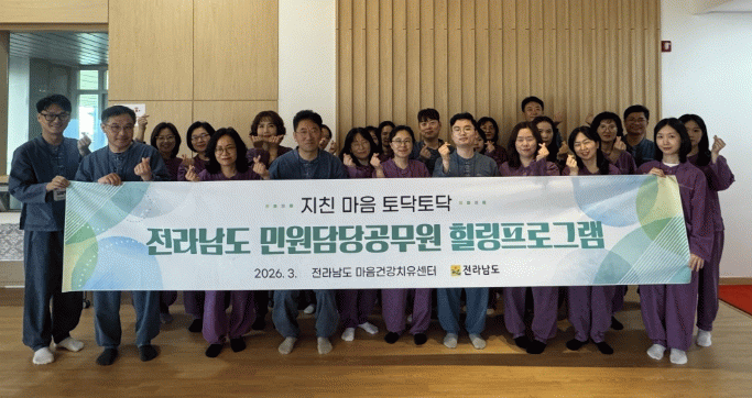 강경문 전남도 도민행복소통실장은 “행정의 최일선에서 일하는 민원담당 공무원의 심신회복이 곧 도민을 위한 더 나은 행정서비스로 이어질 것”이라며 “앞으로도 민원담당 공무원의 역량강화와 심신치유를 통해 도민에게 더 친절하고 신뢰받는 민원서비스를 제공하겠다”고 말했다.