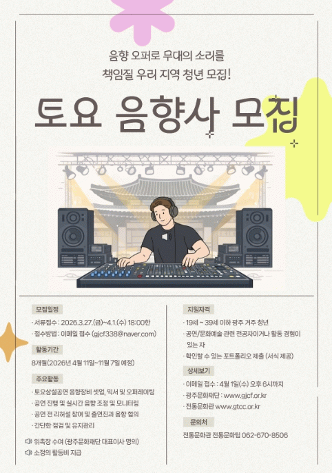 모집 대상은 '광주광역시 청년정책 기본조례' 제2조 제1항에 따른 만 19세 이상 39세 이하 청년으로, 전통 문화예술 또는 음향·공연기술 분야 관련 전공자이거나 활동 경험이 있는 자다. 지원자는 관련 경력 및 역량을 확인할 수 있는 포트폴리오(제출 서식)를 작성·제출해야 한다.