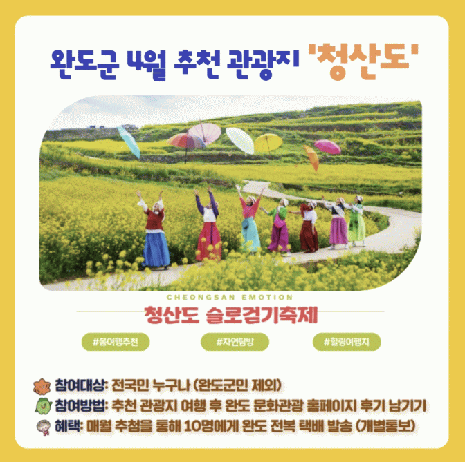 군 관계자는 “올해는 유채꽃이 풍성하게 피어 관광객들에게 잊지 못할 봄날의 추억을 선사할 것으로 기대된다”면서 “다양한 이벤트와 혜택이 있으니 4월에는 슬로시티 청산도를 찾아주시길 바란다”라고 말했다.