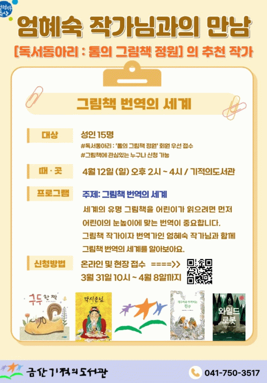 신청은 3월 31일 오전 10시부터 현장 및 온라인으로 할 수 있으며 자세한 내용은 금산군립도서관 홈페이지에서 확인할 수 있다.