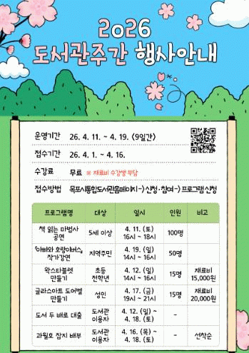 시 관계자는 “도서관의 날과 도서관 주간을 맞아 마련한 다양한 프로그램을 통해 시민들이 즐겁고 의미 있는 시간을 보내길 바란다”고 말했다.
