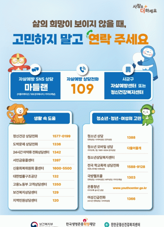 한편, 주변에 우울감으로 힘들어하거나 말하기 어려운 고민이 있어 고통받는 가족·지인이 있다면 자살예방 상담전화(109) 또는 정신건강 위기상담전화를 통해 24시간 전문가의 상담을 받을 수 있다.