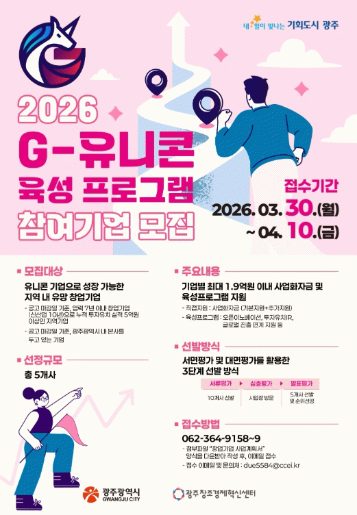 오영걸 경제창업국장은 “지(G)-유니콘 육성프로그램은 잠재력 있는 창업기업이 세계 시장에서 경쟁할 수 있도록 지원하는 사업”이라며 “광주를 대표할 기술력과 성장성을 갖춘 기업들의 많은 관심과 참여를 바란다”고 말했다.