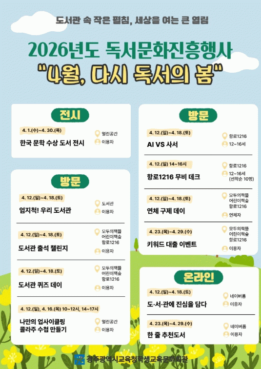 이번 행사는 도서관의 날(4월12일)과 도서관주간(4월12~19일)을 맞아 시민들이 다채로운 프로그램을 통해 책에 대한 흥미를 높일 수 있도록 지원하기 위해 마련됐다.