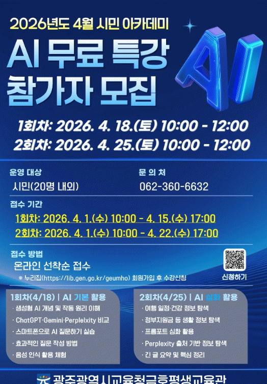 오는 4월 18일과 25일 진행되는 ‘AI 활용’ 강좌의 수강 신청은 4월 1일 오전 10시부터 금호평생교육관 누리집에서 하면 된다.