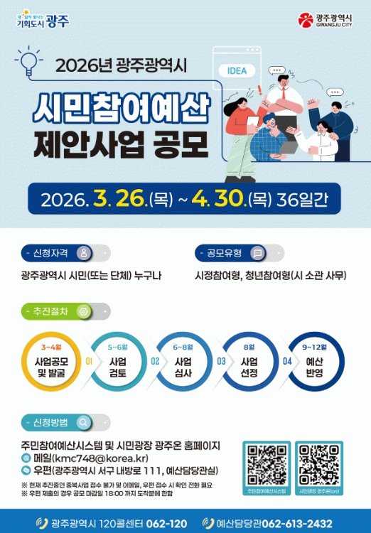 참여는 광주시 누리집 시민참여예산시스템 주민e참여시스템 혹은 시민광장 광주온으로 온라인 신청할 수 있다. 전자우편과 우편(광주 서구 내방로111, 예산담당관실) 신청도 가능하다.
