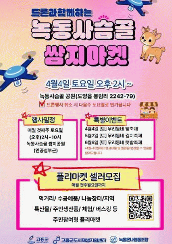 군 건설과 관계자는 “녹동 사슴골 쌈지마켓은 주민 주도의 도시재생과 지역 상권 활성화를 위한 행사”라며 “앞으로도 지역민이 중심이 되는 지속 가능한 도시재생 행사를 이어가겠다”고 말했다.