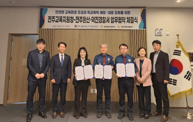 전주교육지원청은 31일 전주꽃심호텔 세미나실에서 전주완산경찰서, 전주덕진경찰서와 학교폭력 예방과 학생안전·보호 강화를 위한 업무협약을 체결했다.