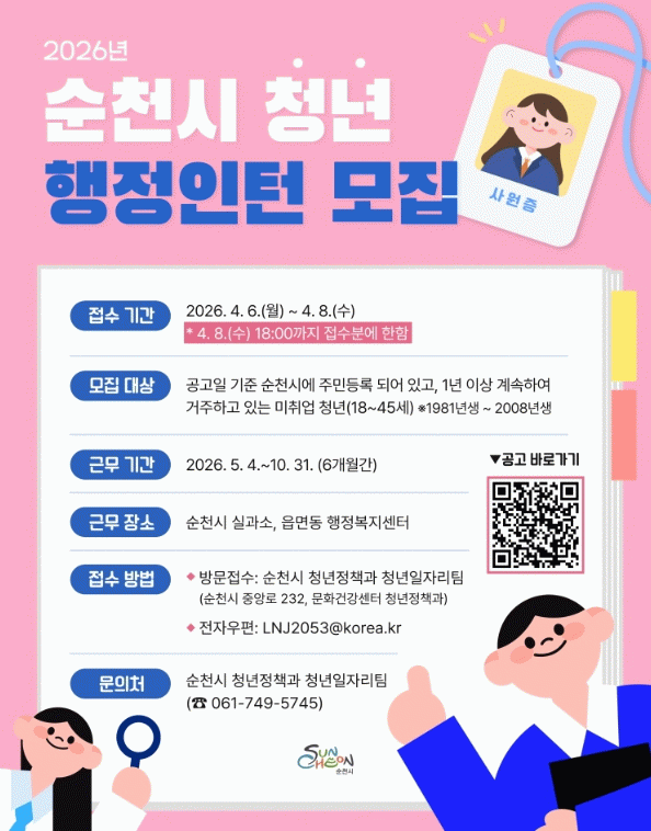 모집기간은 4월 6일부터 8일까지이며, 신청 대상은 공고일(3월 30일) 기준 순천시에 주민등록을 둔 미취업 청년(18~45세)이다. 단, 현재 취업중인 자 및 행정인턴 참여자는 제외된다.