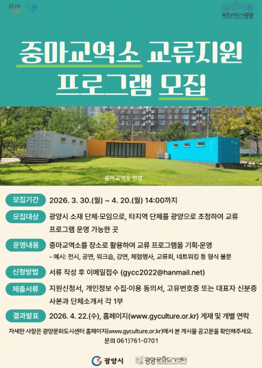 프로그램 운영 기간은 2026년 5월부터 11월까지이며, 선정 단체는 기간 중 1회 중마교역소 공간을 활용해 교류 프로그램을 진행하게 된다. 광양문화도시센터는 이번 사업이 지역 간 문화교류를 넓히고 시민 참여형 문화 활동을 확산하는 계기가 될 것으로 기대하고 있다.