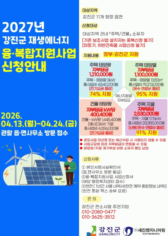 특히 이번 사업은 정부와 강진군이 공동으로 지원하는 사업으로, 주택 태양광은 약 74%, 태양열은 약 95%, 지열은 약 91% 지원이 이뤄져 군민의 초기 설치 부담을 크게 낮출 수 있으며, 전기요금 및 냉난방비 절감 효과가 기대된다.