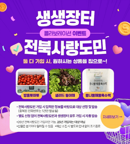 대상은 전북생생장터 기존 회원 중 전북사랑도민증 신규 가입자 또는 전북사랑도민증 가입자 중 전북생생장터 신규 회원이다.