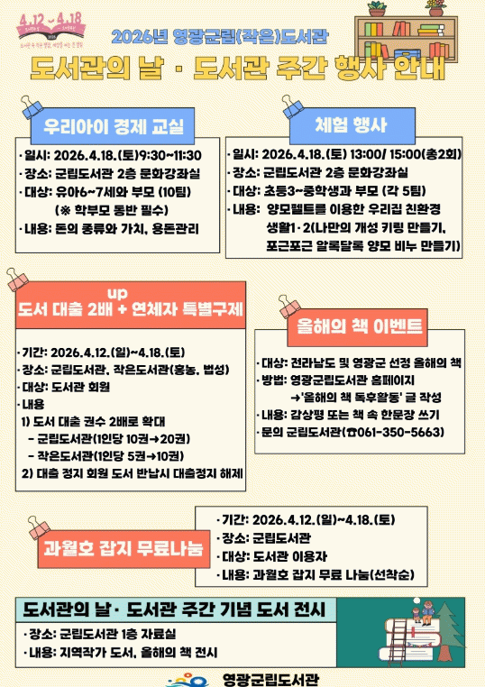 또한, 군립도서관과 작은도서관(홍농, 법성)에서는 ▲도서 대출 2배 up ▲연체자 특별구제 ▲과월호 잡지 나눔도 함께 진행한다.