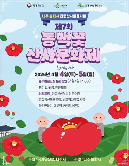 2일 나주시에 따르면 국가유산청과 나주시가 주최하고 대한불교조계종 불회사(주지 철인스님)가 주관하는 ‘2026년 전통산사 국가유산 활용사업 제7회 동백꽃 산사문화제’가 오는 4월 4일부터 5일까지 이틀간 나주 불회사 일원에서 열린다.