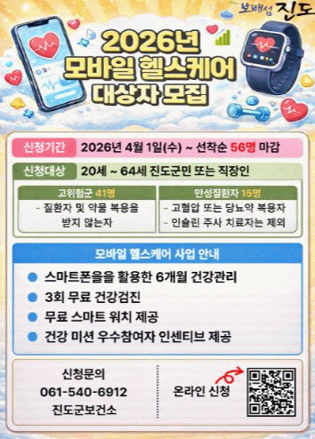 진도군보건소 관계자는 “모바일 헬스케어 2기는 건강위험 요인이 높은 대상자뿐만 아니라 혈압, 당뇨약을 복용 중인 대상자도 참여할 수 있도록 참여 대상을 확대했으며, 이를 통해 군민 스스로 건강을 관리하는 능력을 키우고, 군민의 만성질환을 예방하며 건강 수준을 향상하기 위해 최선을 다하겠다”라고 말했다.