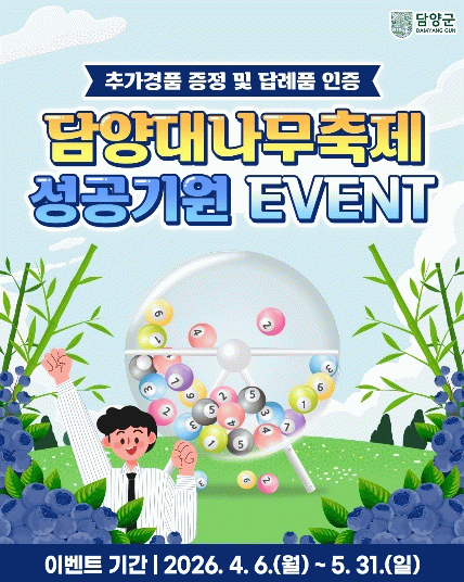 ‘제25회 담양대나무축제 성공기원’이벤트는 4월 6일부터 5월 15일까지 40일간 진행되며, 이벤트 기간 내 담양군에 10만 원 이상 기부하면 별도의 신청 절차 없이 자동으로 응모된다.