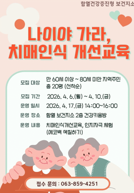 익산시 함열건강증진형 보건지소는 6일부터 10일까지 '나이야 가라, 치매 인식개선 교육' 참여자 20명을 모집한다.