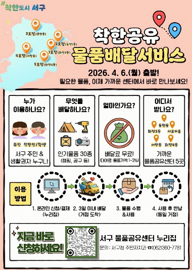 서구는 현재 화정2동, 화정4동, 동천동, 농성1동, 서창동 등 관내 5개소에 물품공유센터를 구축‧운영 중이며 주민 누구나 생활용품을 보다 쉽고 편리하게 이용할 수 있는 기반을 마련했다. 이번 퀵 쉐어 서비스는 주민이 물품공유센터 누리집을 통해 원하는 물품을 신청하면 3일 이내에 이용자가 지정한 가장 가까운 공유센터로 물품을 이동·배달해주는 방식으로 운영된다. 이에 따라 주민들은 여러 센터를 직접 찾아다닐 필요 없이 생활권 내 가까운 거점에서 편리하게 물품을 수령할 수 있다.