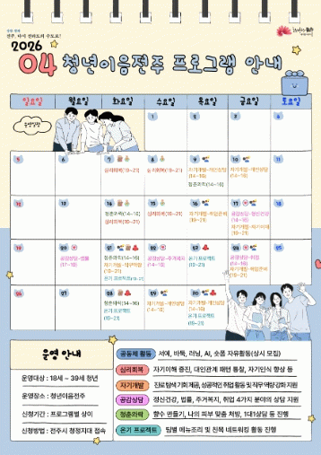 또한 청년이음전주에서는 이번 공감상담과 함께 △공동체 활동(바둑, 서예, 러닝, AI, 숏폼) △심리 회복 △자기개발 △청춘와락 △온기 프로젝트 등 다양한 프로그램을 운영하고 있다.