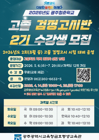 금호평생교육관 정운용 관장은 “검정고시반을 통해 학습자들이 학력 취득의 기쁨을 누리고 배움에 대한 자신감을 얻길 바란다”며 “배움의 열정을 가진 시민들의 꿈과 도전을 응원한다”고 말했다.