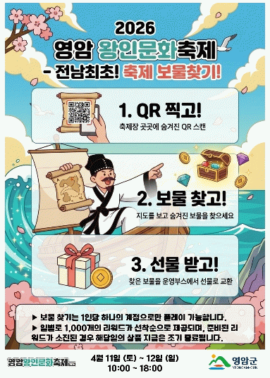 홍연주 영암군 관광과장은 “이번 보물찾기 프로그램은 전라남도 최초로 도입되는 디지털 기반 축제 콘텐츠”라며 “다양한 연령층, 특히 젊은 관광객 유입을 통해 축제의 활력을 높이고, 영암왕인문화축제의 브랜드 가치를 한층 강화할 것으로 기대한다”고 밝혔다.