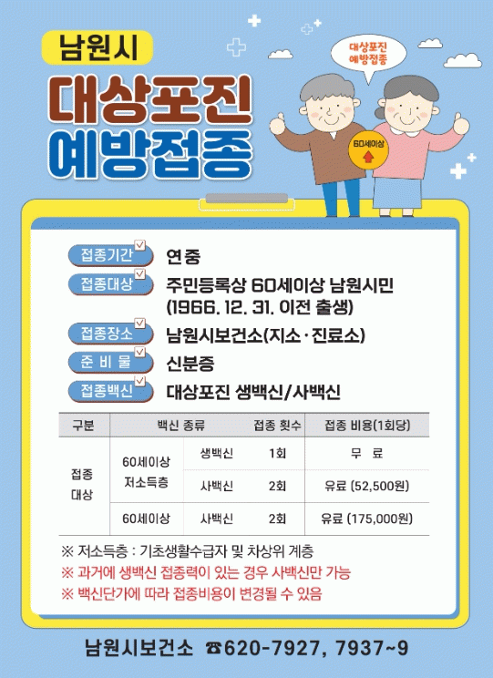 60세 이상 일반 시민의 경우, 사백신 접종을 지원하며 1회당 175,000원(총 2회 접종)의 본인부담금으로 이용할 수 있다.
