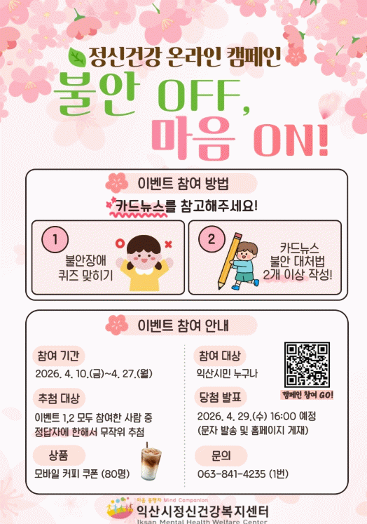 익산시정신건강복지센터(센터장 양찬모)는 오는 10~27일 '불안 OFF, 마음 ON'을 주제로 시민 참여형 정신건강 온라인 캠페인을 진행한다.