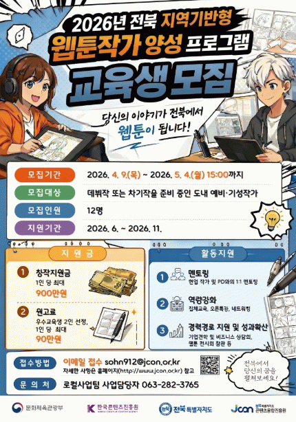 진흥원 김성규 원장은 “전북 지역의 잠재력 있는 웹툰 작가들을 발굴·양성하기 위해 올해 모집 인원을 12명으로 확대했다”며, “창작자들이 데뷔와 연재로 이어질 수 있도록 지속적인 지원을 이어가겠다”고 밝혔다