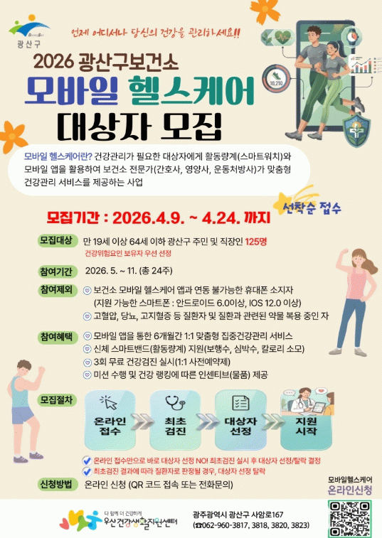 신청은 24일까지며 스마트폰을 소지한 구민이라면 정보무늬(QR코드) 또는 우산건강생활지원센터로 전화 신청하면 된다.