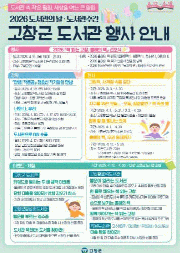 어린이특강으로는 그림책 ‘안녕! 작은 곰’의 정호선 작가와의 만남이 마련되며, 고창군립성호도서관에서는 ‘너와 나, 우리’, ‘도서관으로 ON 숏폼’ 등 다양한 강좌가 진행돼 연령대를 아우르는 풍성한 독서활동이 펼쳐진다.