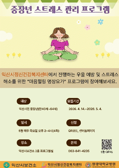 익산시정신건강복지센터는 만 40~64세 중장년을 대상으로 '마음힐링 명상요가' 프로그램을 운영한다고 13일 밝혔다.