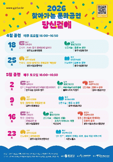 올해 첫 막을 올리는 4월18일 공연은 동구와 남구에서 각각 진행된다. 동구문화센터에서는 광주포크음악협회의 ‘콘서트–포크(Folk), 향기 봄바람에 날리다’ 밴드 공연이, 남구 물빛근린공원에서는 광주시립창극단의 ‘풍류 인(in) 광주’ 전통예술 공연이 무대에 오른다.