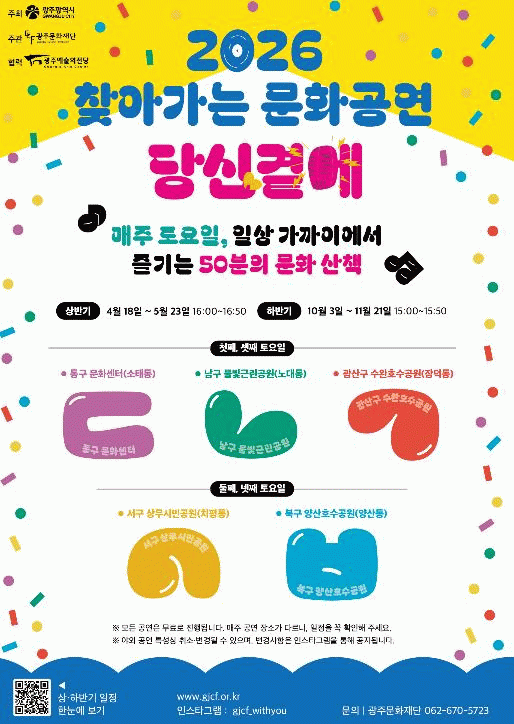 배동환 광주문화재단 사무처장은 “찾아가는 문화공연은 시민들이 일상에서 자연스럽게 문화예술을 접할 수 있도록 기획된 사업”이라며 “올해는 예술인 공연 환경 개선까지 반영해 시민과 예술인 모두가 체감할 수 있는 프로그램으로 운영하겠다”고 밝혔다.