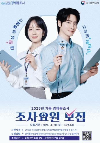 광양시의 모집 인원은 총 45명이며 ▲총조사 업무를 총괄하는 총관리자 1명 ▲현장 조사 지도와 지원을 담당하는 조사관리자 7명 ▲조사 업무를 지원하는 조사지원담당자 3명 ▲사업체를 직접 방문해 조사표를 작성하는 조사원 34명 등이다.