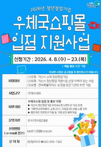 익산시는 '2026년 청년창업기업 우체국쇼핑몰 입점 지원사업'에 참여할 청년창업기업을 오는 23일까지 모집한다.