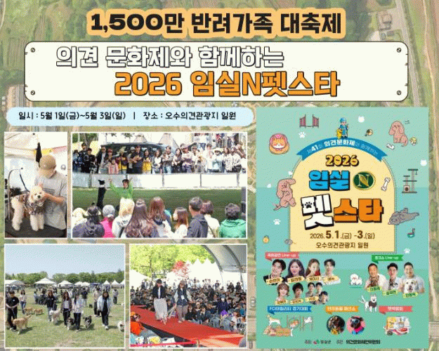 군은 오는 5월 1일부터 3일까지 오수의견관광지 전역에서 제41회 의견문화제와 연계한 ‘2026 임실N펫스타’를 개최한다.