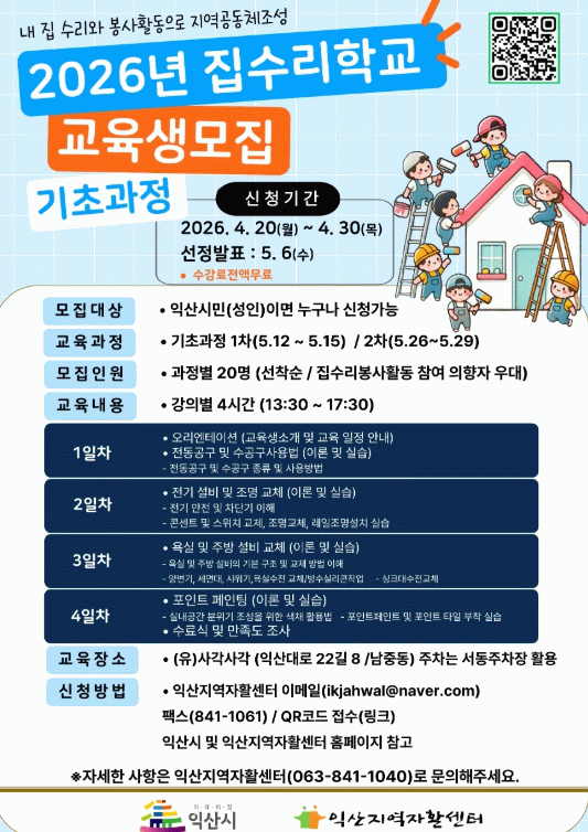 익산시 관계자는 "집수리학교는 기술을 배우는 데 그치지 않고 나눔으로 이어지는 의미 있는 과정"이라며 "자기계발과 봉사활동에 관심 있는 시민들의 적극적인 참여를 기대한다"고 말했다.