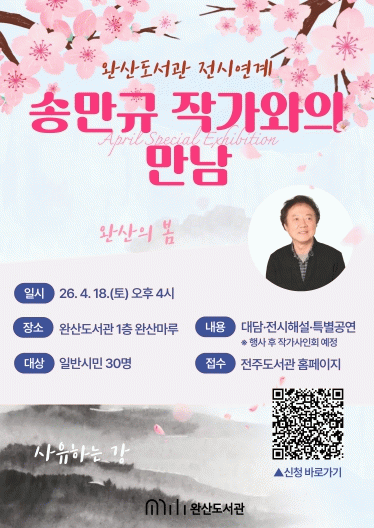 이영섭 전주시 도서관평생학습본부장은 “꽃동산이 아름다운 계절에 송만규 작가와의 만남을 통해 예술적 감성을 채우는 시간을 가지시길 바란다”면서 “이후 이어지는 지역 예술인들의 대관 전시에도 시민 여러분의 지속적인 관심과 참여를 부탁드린다”고 말했다.