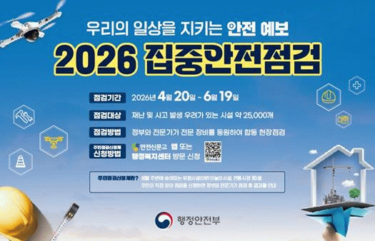 아울러 올해는 주민이 생활 주변의 위험 요인을 직접 제보하고 점검에 참여할 수 있도록 ‘주민점검신청제’를 운영해 주민 참여형 안전관리도 강화할 방침이다.