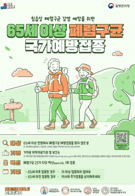 65세 이상 폐렴구균 무료 예방접종은 주소지와 상관없이 가까운 보건소나 위탁 의료기관에서 폐렴구균 23가 다당질백신(PPSV23)을 1회 접종하며, 65세 이후 이미 접종한 경우 추가 접종할 필요는 없다.
