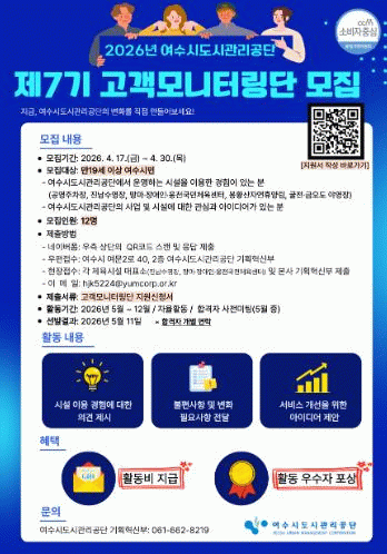 송병구 이사장은 “시민이 직접 참여하는 고객모니터링단 운영을 통해 현장의 작은 불편까지 세심하게 점검하고, 시민이 체감할 수 있는 실질적인 서비스 개선을 이루겠다”며 “관심 있는 시민들의 많은 참여를 바란다”고 밝혔다.