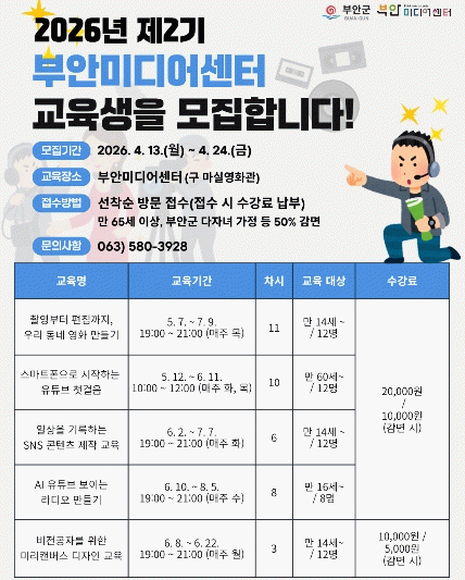 교육은 스마트폰을 활용한 유튜브 기초 과정, 영상 촬영 및 편집, SNS 콘텐츠 제작, AI 보이는 라디오 제작, 미리캔버스를 활용한 디자인 교육, 단편영화 제작 과정 등으로 운영된다.