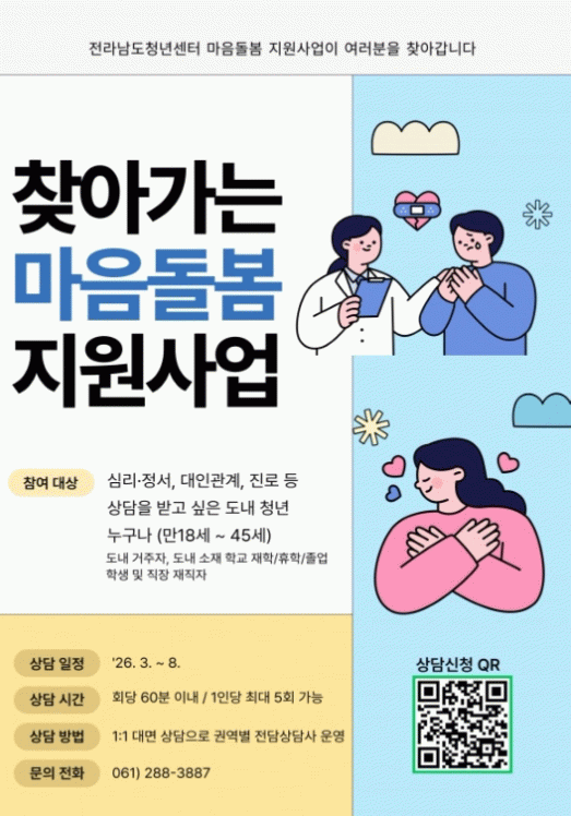 신청은 전라남도청년센터 누리집을 통해 가능하며, 마음치유가 필요한 청년은 누구나 신청할 수 있다. 전문상담사가 권역별로 직접 방문해 상담한다.